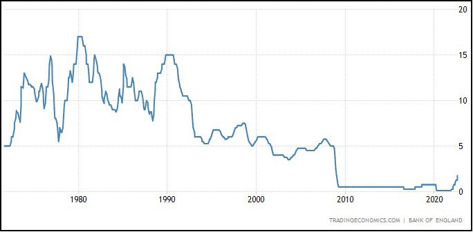 應對本輪通脹,英國央行在4日的會上決定一次性加息50個基點,為自1995年以來最大的加息幅度。不過,目前英國的利率仍然僅1.75%,與其歷史高峯相差甚遠。