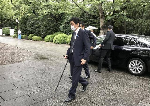 2021年8月13日,岸信夫拄着枴杖參拜靖國神社。 圖片來源:NHK