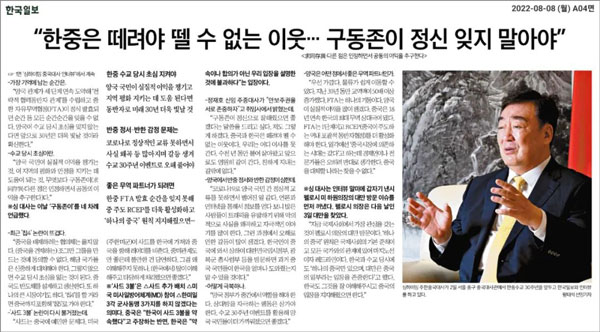 在數千年的交往歷史中,中韓相互學習、相互借鑑,共同傳承和發展了東方文明。相似會促進相互理解,但有時候也容易出現矛盾。如果深究,很多由誤會造成的矛盾説清楚就可以了,有些學術爭議也可以在學術範圍內研究和討論,沒必要政治化。但我們要提防和反對的是,有人人為地在中韓間製造矛盾,故意挑撥兩國民意對立。中韓關係已經走進三十而立的成熟階段,相信兩國人民完全可以通過相互尊重、包容和理解來化解分歧。希望包括《韓國日報》在內的所有媒體朋友,為此多發揮積極作用。