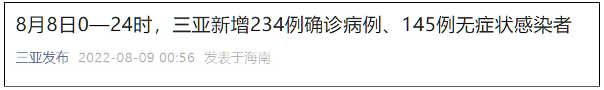 “三亞發佈”微信公眾號消息,根據三亞市新型冠狀病毒肺炎疫情防控工作指揮部,8月8日0—24時,三亞市新增234例確診病例(其中43例為無症狀感染者轉歸)、145例無症狀感染者。8月1日0時至8月8日24時,累計發現確診病例1035例、無症狀感染者511例。