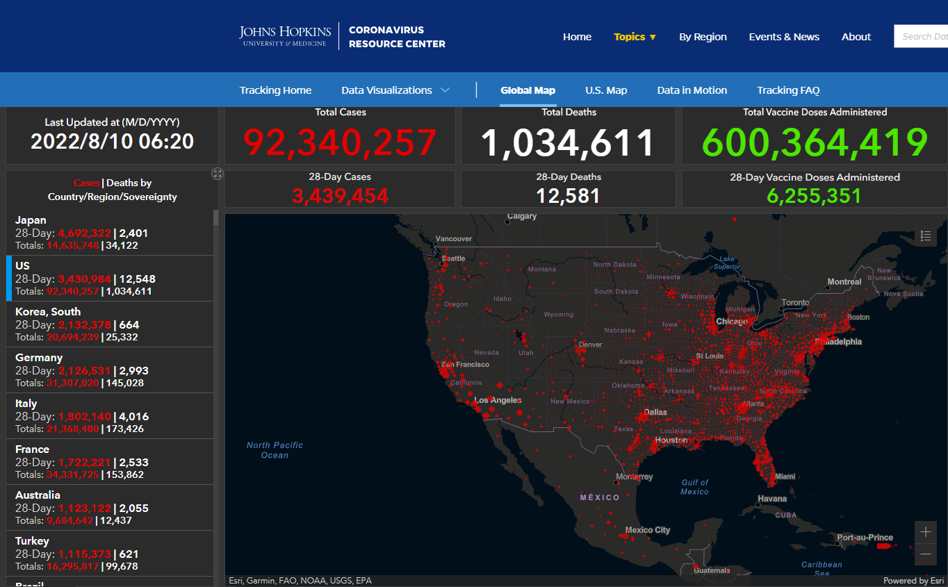 (觀察者網訊)根據美國約翰斯·霍普金斯大學統計數據,截至北京時間8月10日6時20分,美國新冠肺炎累計感染病例達到92340257例,累計死亡病例達到1034611例。在過去約24小時內,美國新增感染病例105114例,新增死亡病例621例。
