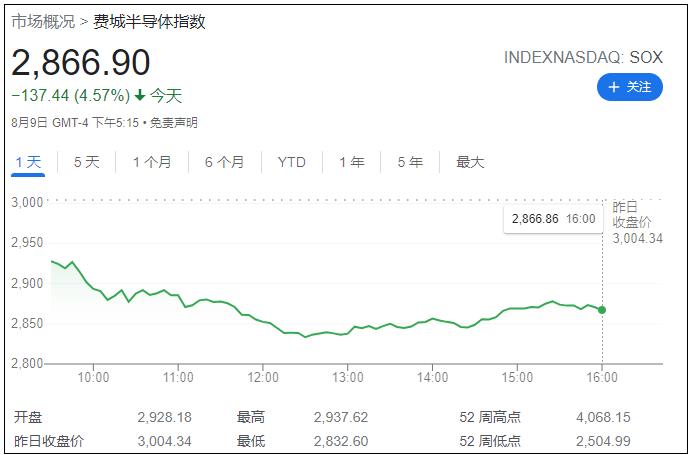 截至當地時間9日16時,費城半導體指數跌4.57%