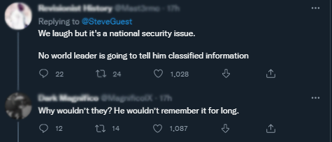 有美國網民回覆道:我們就笑吧,但實際上這事關乎國家安全。(鑑於拜登的情況)其他國家領導人將不會再告訴他一些機密信息了。