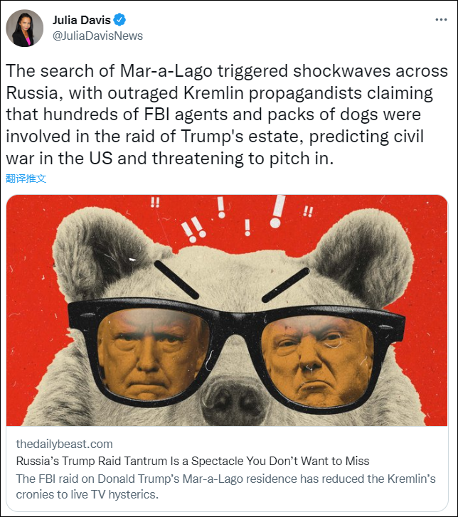 值得一提的是,在特朗普被FBI“抄家”次日,茱莉亞·戴維斯就在“每日野獸”網站刊文羅列了俄羅斯媒體對此事的反應,稱FBI的搜查在俄羅斯引發震動,她將俄羅斯媒體的反應形容為“歇斯底里”,稱這是“你不能錯過的奇觀”。