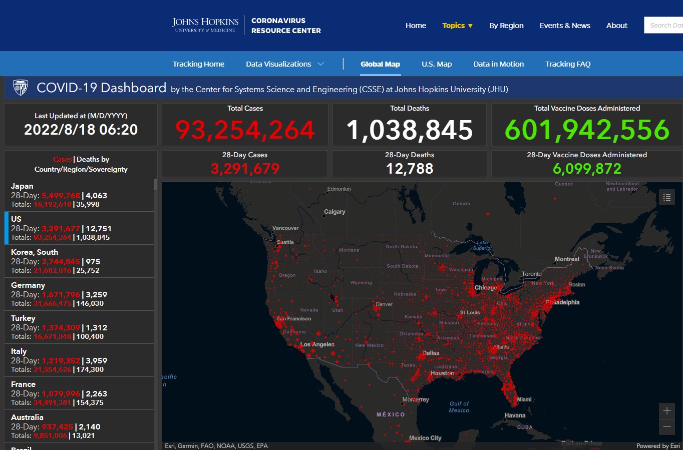 (觀察者網訊)根據美國約翰斯·霍普金斯大學統計數據,截至北京時間8月18日6時20分,美國新冠肺炎累計感染病例達到93254264例,累計死亡病例達到1038845例。在過去約24小時內,美國新增感染病例116901例,新增死亡病例929例。
