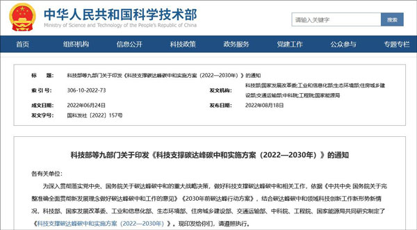 科技部網站18日發佈“科技部等九部門關於印發《科技支撐碳達峯碳中和實施方案(2022—2030年)》的通知”,在新能源發電、儲能技術、氫能技術等方面提出具體研發技術目標。