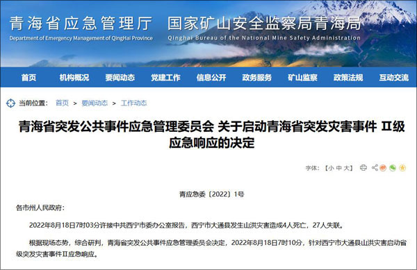 根據現場態勢,綜合研判,青海省突發公共事件應急管理委員會決定,2022年8月18日7時10分,針對西寧市大通縣山洪災害啓動省級突發災害事件Ⅱ應急響應。