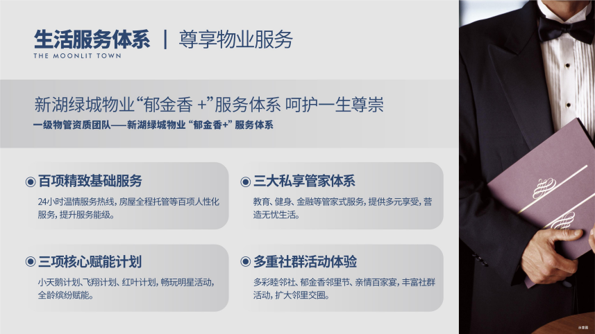 不同於類似文旅項目的混亂管理,新湖與綠城憑藉多年運營經驗和實力,專門為項目打造了擁有一級資質的新湖綠城物業物管團隊,包含百項精緻基礎服務,教育、健身、金融等三大私享管家體系。