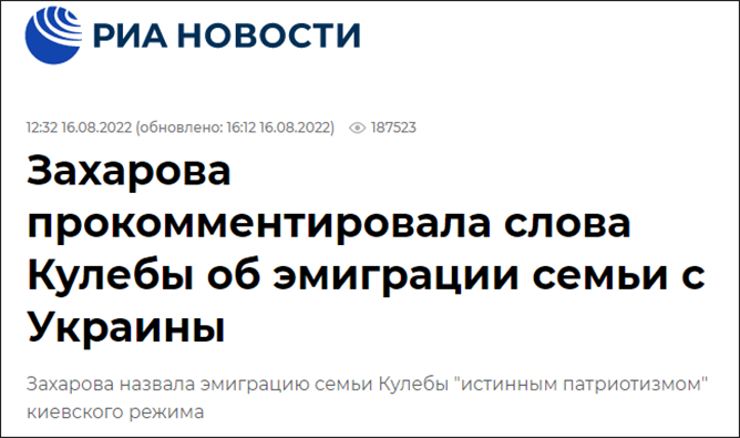 庫列巴在談到這場分別時,帶着一副悵然的神情,但對於他承認家人、寵物狗已離開烏克蘭一事,據俄新社16日報道,俄羅斯外交部發言人扎哈羅娃則在Telegram上諷刺稱,“你需要知道的關於基輔政權愛國主義真相的一切。(即)狗高於一切。”