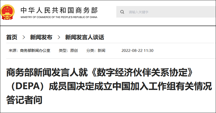 據商務部官網8月22日消息,商務部新聞發言人就《數字經濟夥伴關係協定》(DEPA)成員國決定成立中國加入工作組有關情況答記者問。