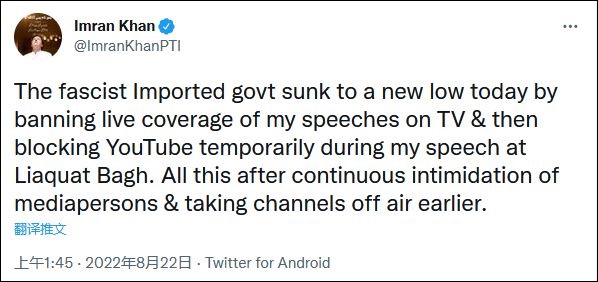 汗當地時間21日指控現政府封禁他的演講,並屏蔽YouTube直播