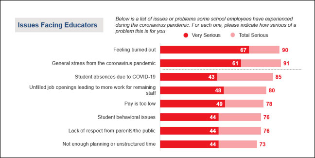 除了新冠疫情導致的倦怠而離開該行業外,學生在疫情期間頻繁缺課、工資不足和教學資金被削減、以及學生行為問題(如校園暴力)等都成為美國教師認為“應該離開該行業”的理由。美國國家教育協會最近的一項調查顯示,55%的教育工作者比預期更早退出教師行業。