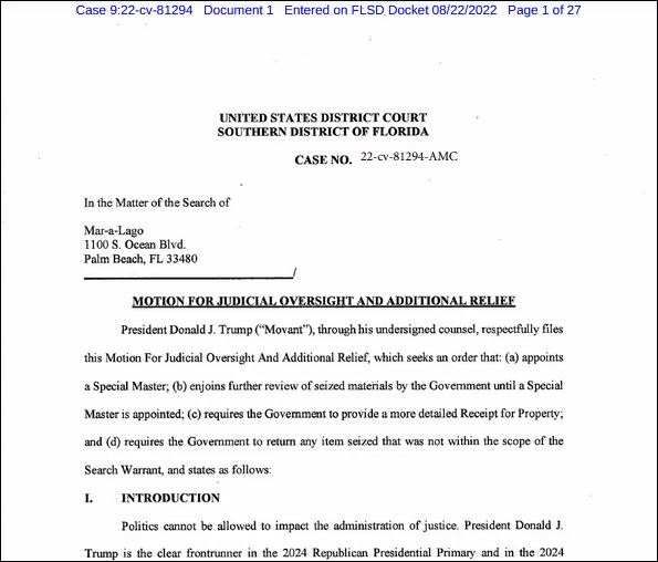 此外,起訴書還重提了特朗普的觀點,認為FBI的調查是出於政治動機,目的是阻止他在2024年競選總統,以及阻止其他共和黨候選人蔘加11月中期選舉的前景。美國聯邦憲法第四修正案中規定個人有權反對不合理的搜查和扣押,聯邦政府侵犯了他的權利。