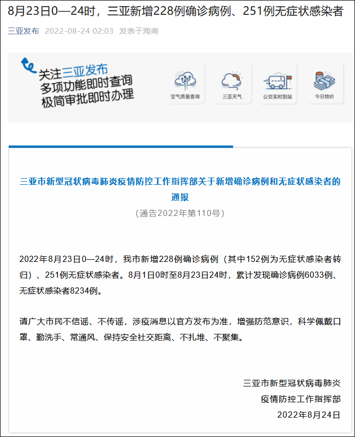 據微信公眾號“三亞發佈”消息,根據三亞市新型冠狀病毒肺炎疫情防控工作指揮部通報,2022年8月23日0—24時,三亞新增228例確診病例(其中152例為無症狀感染者轉歸)、251例無症狀感染者。8月1日0時至8月23日24時,累計發現確診病例6033例、無症狀感染者8234例。