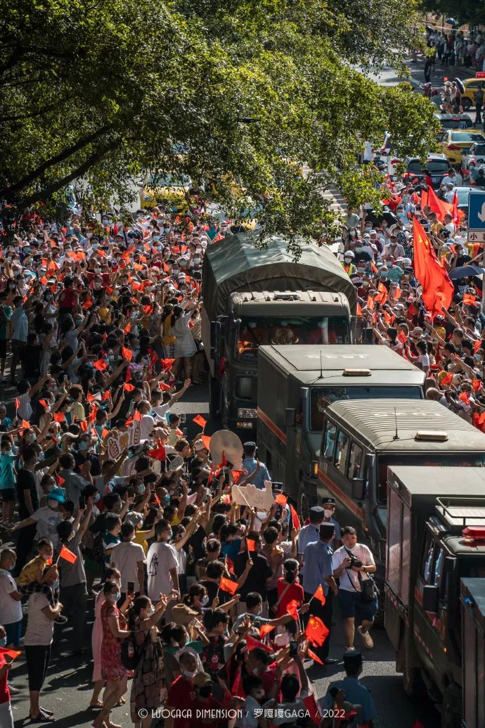 羣眾圍在撤離車隊兩側 他眼含熱淚緊握戰士雙手
