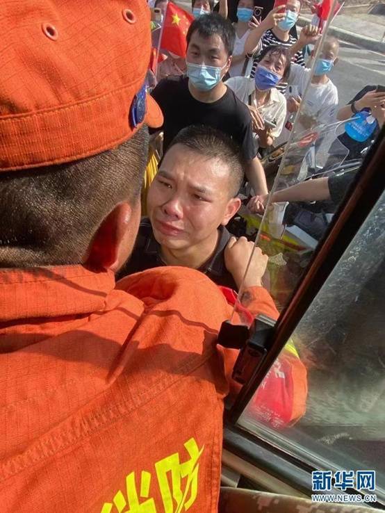 送行現場,一位羣眾探進車窗內,緊握消防戰士的雙手,含淚道別。