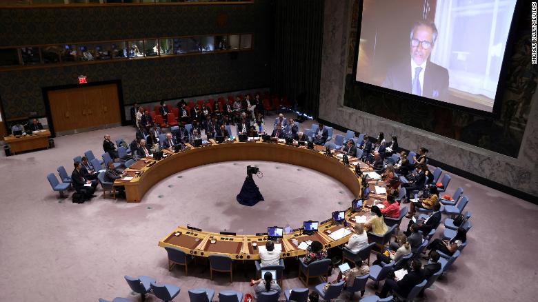 國際原子能機構總幹事格羅西於8月11日在聯合國安理會會議上發表講話(圖自CNN)