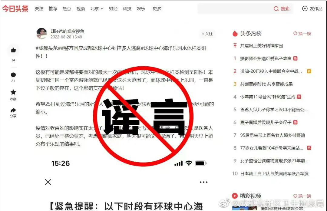 @成都高新區衞生健康局 28日表示,有網友在多個微信羣和公開平台發佈信息稱,環球中心海洋樂園水體樣本陽性,引發社會關注。此消息為不實信息。經疾控部門核實,環境檢測結果均為陰性。請廣大網友不造謠、不信謠、不傳謠!