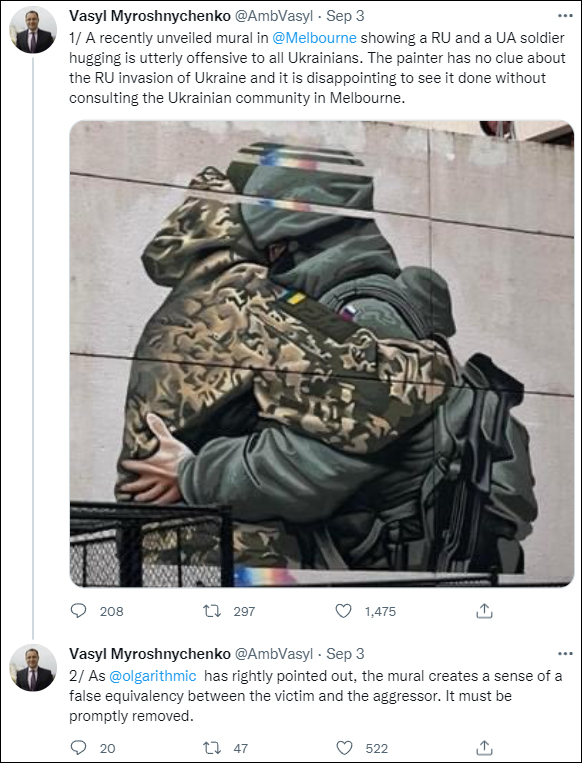 烏克蘭駐澳大利亞大使瓦西里·米羅什尼琴科(Vasyl Myroshnychenko)3日在推特發文稱,該壁畫“完全是對所有烏克蘭人的冒犯”,並呼籲將其移除。
