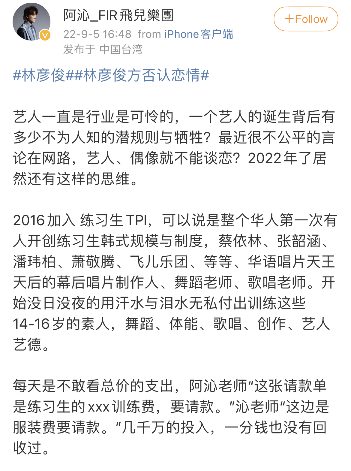 阿沁隨後提到林彥俊2016年成為TPI練習生的過往,並用很長的篇幅回憶自己對TPI“沒日沒夜地用汗水與淚水無私付出”,“幾千萬的投入,一分錢也沒有回收過”。