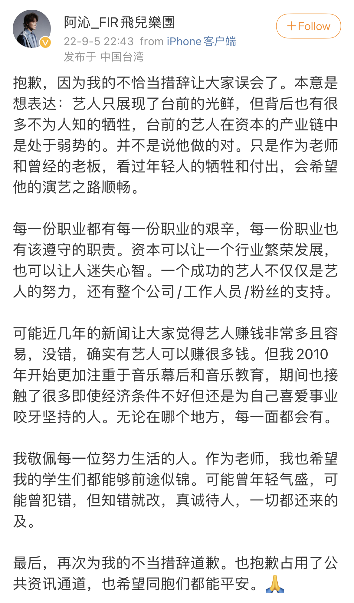 (觀察者網訊)9月5日深夜,飛兒樂團吉他手阿沁在微博發文,為此前“不恰當措辭”致歉,稱本意是想表達“台前的藝人在資本的產業鏈中是處於弱勢的”。