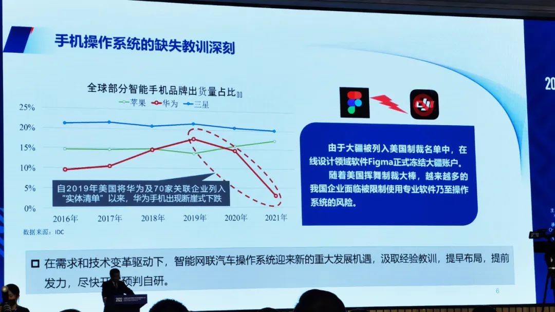 所以通過手機這個操作系統的缺失,使我們深深地認識到,在功能產品向智能產品的轉換過程當中,如果沒有操作系統,芯片再強,汽車做的再好,都是在沙灘上起高樓,如果“缺芯少魂”這個問題不解決我們走不快、也走不遠。