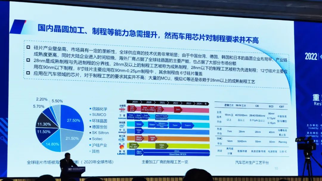 對於車規級芯片來説,除了少量的AI芯片之外,包括CPU、GPU,GPU用一點,CPU用一點,有先進製程最好,沒有先進製程我們也可以通過其他的方式來解決,而且在總量上,先進製程芯片佔車規級芯片的比例還是比較低的,還是成熟工藝製程為主的結構。