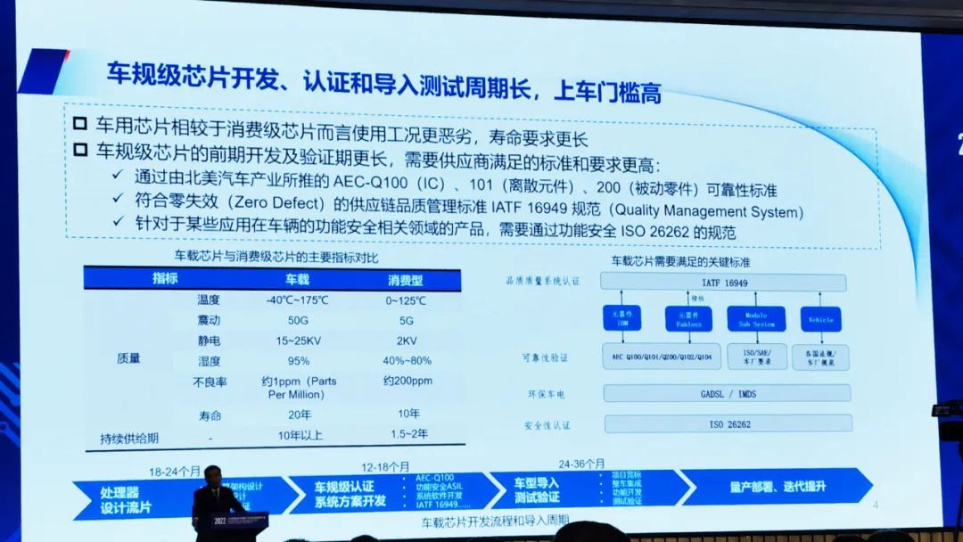 作為芯片的發展來説,前些年先進製程技術要求最高、需求最大的是消費類芯片,以智能手機為代表的消費類芯片的發展,車規級芯片是僅次於軍工級的芯片,比消費級和工業級應用的芯片工況更加惡劣,特別是對壽命的要求更高。另外,車規級的芯片,除了一般的標準以外,也要適應汽車使用的一系列的標準,比如説要證明芯片的可靠性,我們通常把北美推行的AEC-Q100這個標準體系作為我們可靠性驗證的一個標準,比如我們要控制失效率,必須建立起芯片企業的質量控制體系,講到質量控制體系IATF-16949,我們已經轉換成國標,是不可迴避的一個標準認證。講到功能安全,ISO 26262又是必須要經過的一個認證,所以車規級的芯片比消費級、工業級的芯片要求更高,需要認證時間更長,上車的門檻相比消費級也更高。
