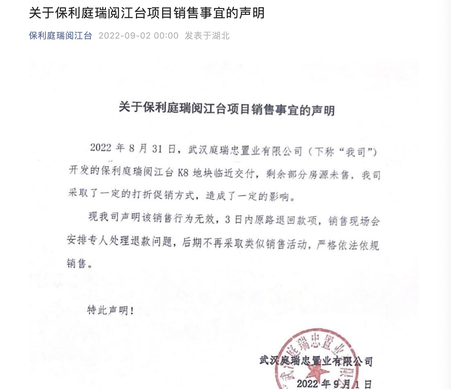 9月1日,保利庭瑞閲江台項目公司發佈聲明稱,公司開發的保利庭瑞閲江台K8地塊臨近交付,剩餘部分房源未售,公司採取了一定的打折促銷方式,造成了一定影響。現聲明該銷售行為無效,3日內原路退回款項,銷售現場會安排專人處理退款問題,後期不再採取類似銷售行為,嚴格依法依規銷售。