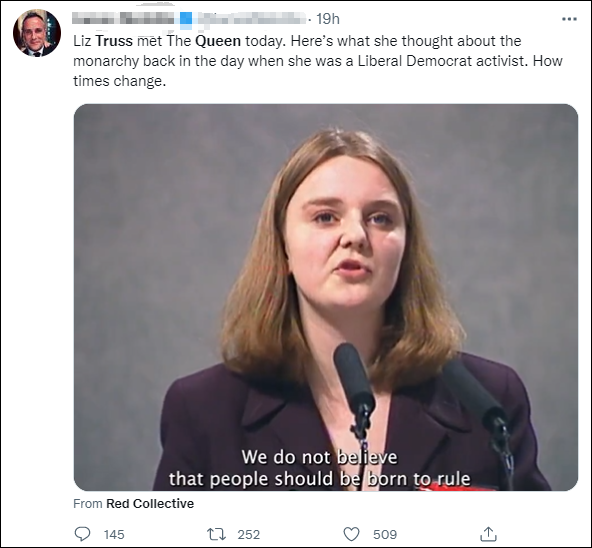 在另外一段視頻中,還在大學時期的特拉斯尚未加入保守黨,她在1994年的一次活動中批評“只有一個家族可以出國家元首”,並稱她不認為“人生來就應該當統治者”。她當時還呼籲廢除君主制,稱她已經徵求了公眾的意見,他們告訴她“廢除他們,我們已經受夠了”。有網民感嘆:“時間真能改變人啊。”