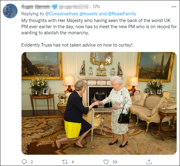 然而,在與女王見面時,特拉斯淺淺行的屈膝禮卻讓部分英國民眾不滿,認為她不尊重女王;她早年發表反君主制言論的“黑歷史”也被人扒出,引發爭議。