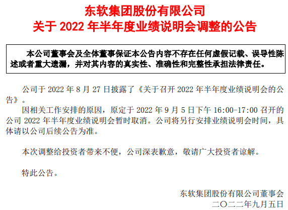 東軟集團公告稱,因相關工作安排的原因,原定於9月5日下午4點召開的2022年半年度業績説明會暫時取消,該公司將另行安排業績會時間。