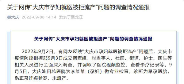 2022年9月2日,有網友反映“大慶市孕婦就醫被拒流產”問題後,大慶市疫情防控指揮部9月3日成立調查組,對當事人、社區、街道、護士、醫生等相關人員進行全面深入調查,並調取了醫院視頻監控,查看診療記錄等。9月5日,大慶油田總醫院為李某某(孕婦)做專業檢查,診斷為早孕活胎,系正常妊娠狀態,未流產。
