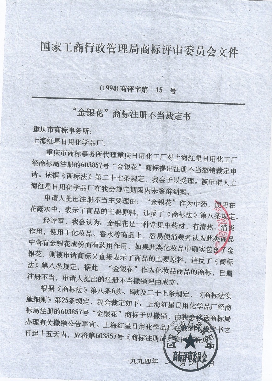國家知識產權局的“金銀花”商標檔案顯示,涉案603857號金銀花商標系1992年由上海紅星日用化學品廠註冊,1994年1月27日,金銀花商標被國家工商行政管理局商標評審委員會予以撤銷,並被要求交回《註冊商標證》。撤銷理由包括,該商標用在化妝品中時直接表示了商品的主要原料,違反了《商標法》,“已屬註冊不當”。撤銷公告時間為1995年,且根據當時法律,該裁定為一裁終局,不能複議。