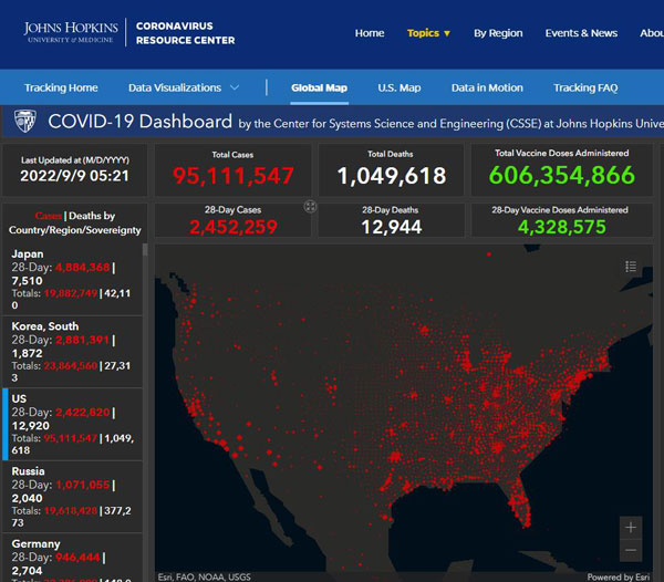 (觀察者網 訊)根據美國約翰斯·霍普金斯大學統計數據,截至北京時間9月9日5時21分,美國新冠肺炎累計感染病例達到95111547例,累計死亡病例達到1049618例。在過去約24小時內,美國新增感染病例103405例,新增死亡病例754例。