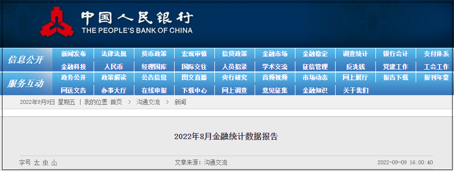央行網站9月9日發佈“2022年8月金融統計數據報告”,以下為報告全文。