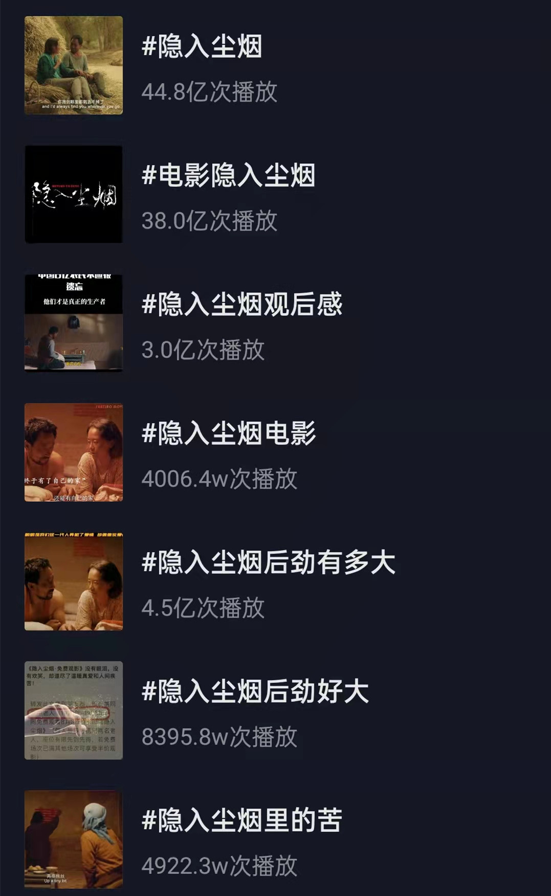 如今的抖音上,“#隱入塵煙”和“#電影隱入塵煙”,兩個話題相加有近83億次播放,其他眾多《隱入塵煙》的相關話題也有着數百萬至數億次不等的播放。