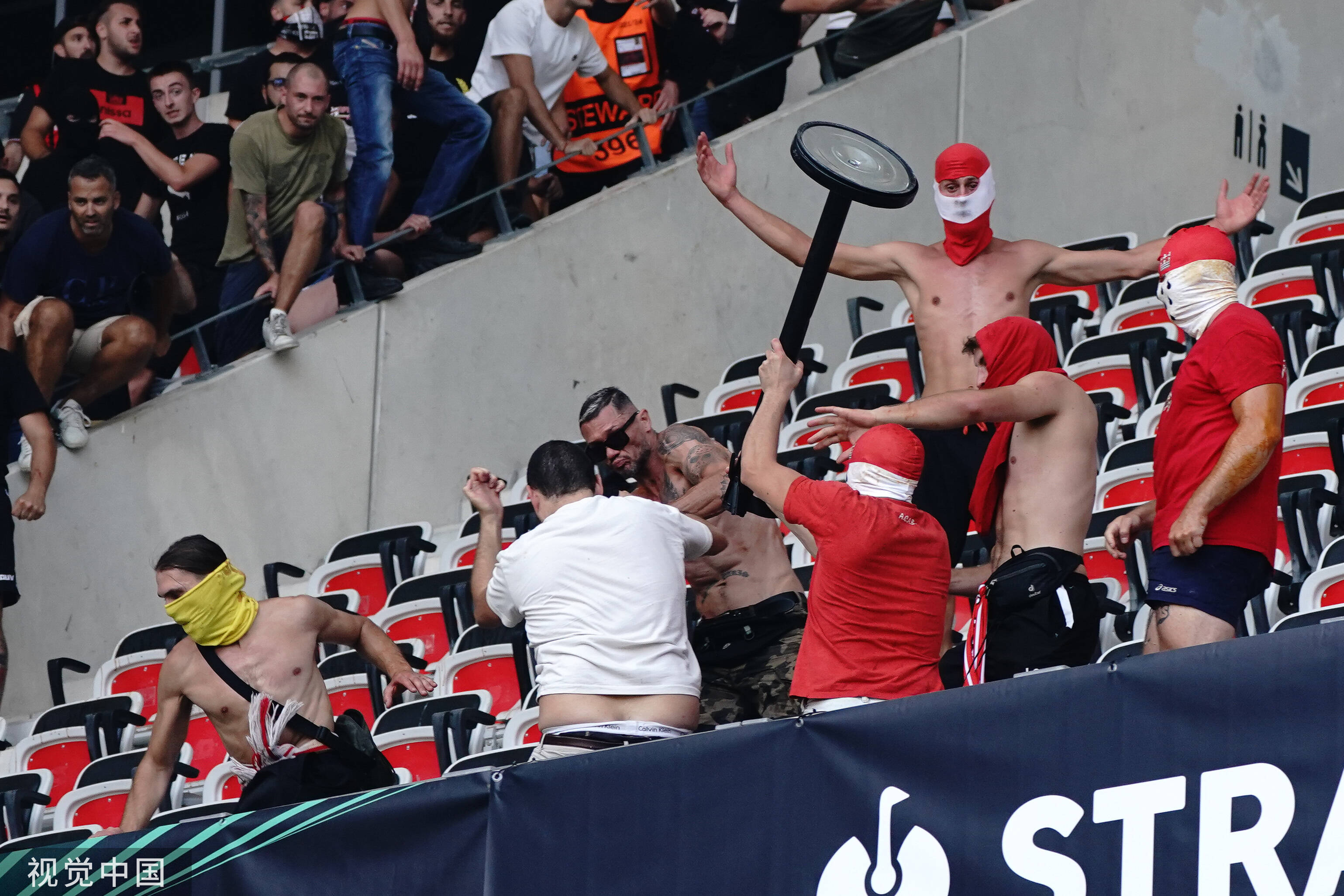 隨後,法國警方、球場安保人員介入,三方纏鬥在一起,場面一度相當混亂。最終,足球流氓羣體在警方的驅逐下潰散,其中一人在逃跑過程中摔下看台,被緊急送往醫院治療,目前已無生命危險。