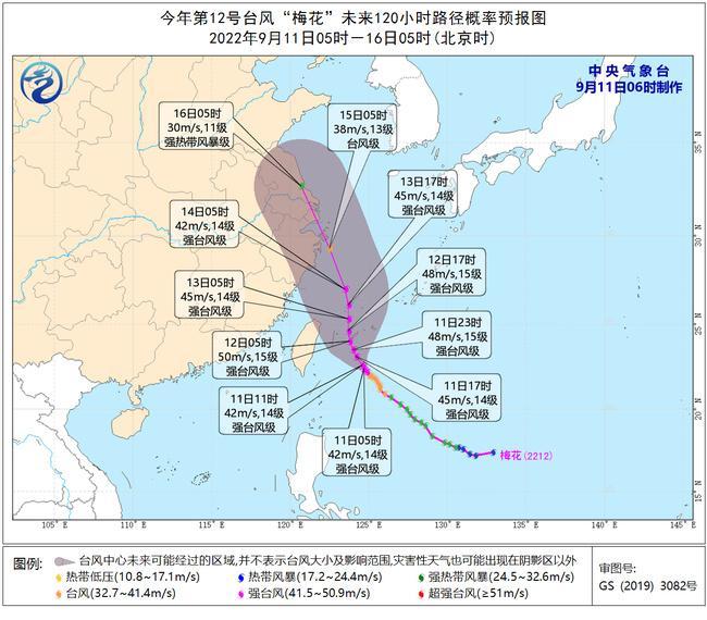 大風預報:9月11日08時至12日08時,東海南部海面、台灣海峽、台灣以東洋麪、巴士海峽、我國台灣島沿海、釣魚島附近海域有6-7級大風,陣風8-9級;東海東南部海域和台灣以東的部分海域有8-11級大風,“梅花”中心經過的附近海面和地區的風力有12-15級,陣風可達16級。