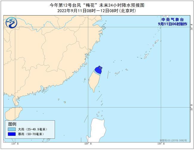 降水預報:9月11日08時至12日08時,台灣北部有中到大雨,局地暴雨。