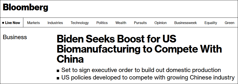 【文/觀察者網 熊超然】據彭博社當地時間9月10日報道,美國總統拜登準備簽署一項行政命令,幫助擴大美國的生物製造業,減少對於中國的依賴。報道指出,美國拜登政府制定這一政策是為了與不斷發展的中國生物製造業相競爭。