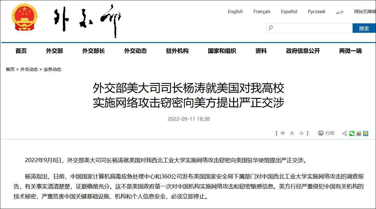 據外交部網站消息,2022年9月8日,外交部美大司司長楊濤就美國對我西北工業大學實施網絡攻擊竊密向美國駐華使館提出嚴正交涉。
