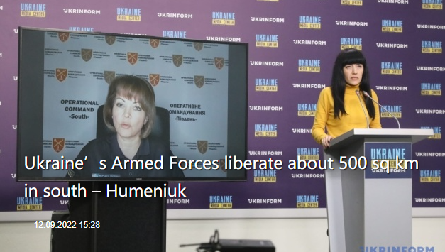 (觀察者網訊)據烏克蘭國家通訊社9月12日報道稱,烏克蘭南方作戰指揮部發言人胡梅紐克當天表示,過去兩週,烏克蘭武裝部隊已在南部重新控制總面積近500平方公里的土地,包括赫爾松地區的維索科皮利亞、新沃茲涅森斯克、比洛吉爾卡、蘇赫斯塔沃克和米羅柳比夫卡。俄方尚未就此作出回應。