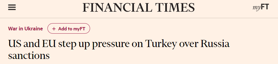 由於擔心土耳其銀行業正為俄羅斯逃避西方金融束縛“開後門”,美國和歐盟正對土耳其加大施壓,要求其打擊逃避反俄製裁的行為。