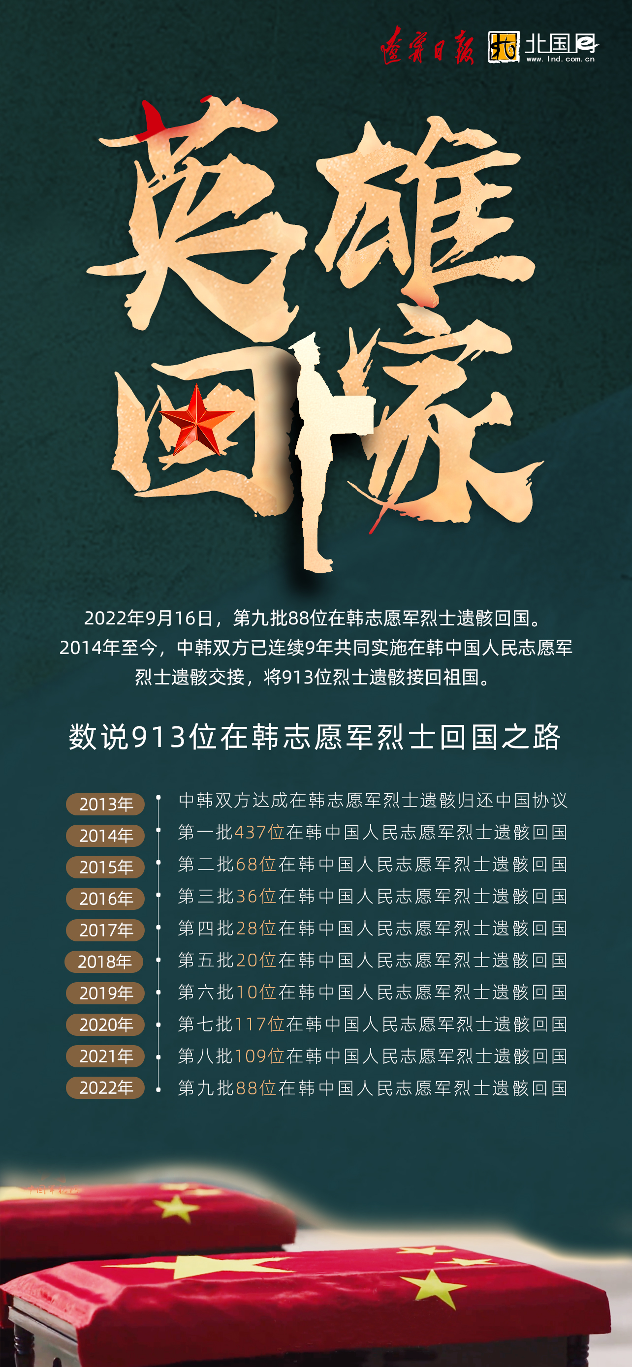 從2014年至今,中韓雙方已連續9年共同實施在韓中國人民志願軍烈士遺骸交接,將913位烈士遺骸接回祖國。