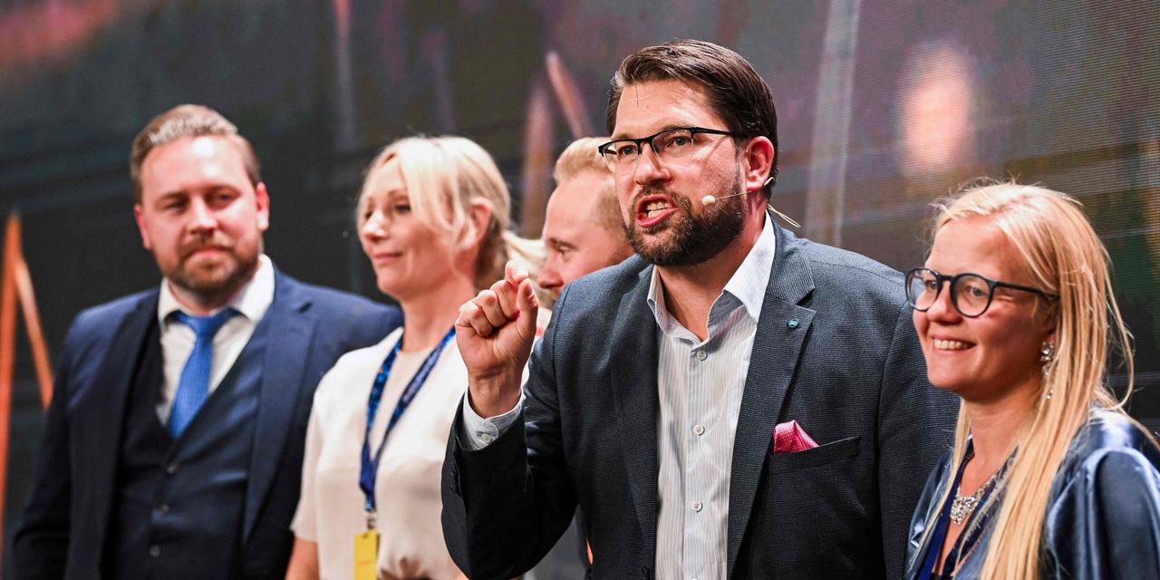 瑞典民主黨主席伊米·奧克松(左三)在慶祝選舉勝利