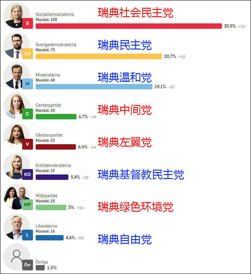 瑞典議會選舉各主要政黨得票率,紅色字體屬於前執政的“紅綠聯盟”,藍色字體的政黨屬於“藍棕聯盟”