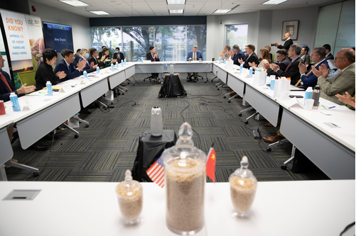16日上午,圓桌會在密蘇里州聖路易斯市美大豆出口協會總部舉行,秦剛大使、美農業部代理副部長幫辦賈森·哈夫邁斯特、農業農村部國際合作司副司長韋正林、美國腹地中國協會會長、前密蘇里州州長霍頓、世界糧食獎基金會名譽主席奎因大使、美大豆出口協會主席蘇健、艾奧瓦州農場主金伯利、中美農業領域企業代表和專家學者等線上線下共同出席。