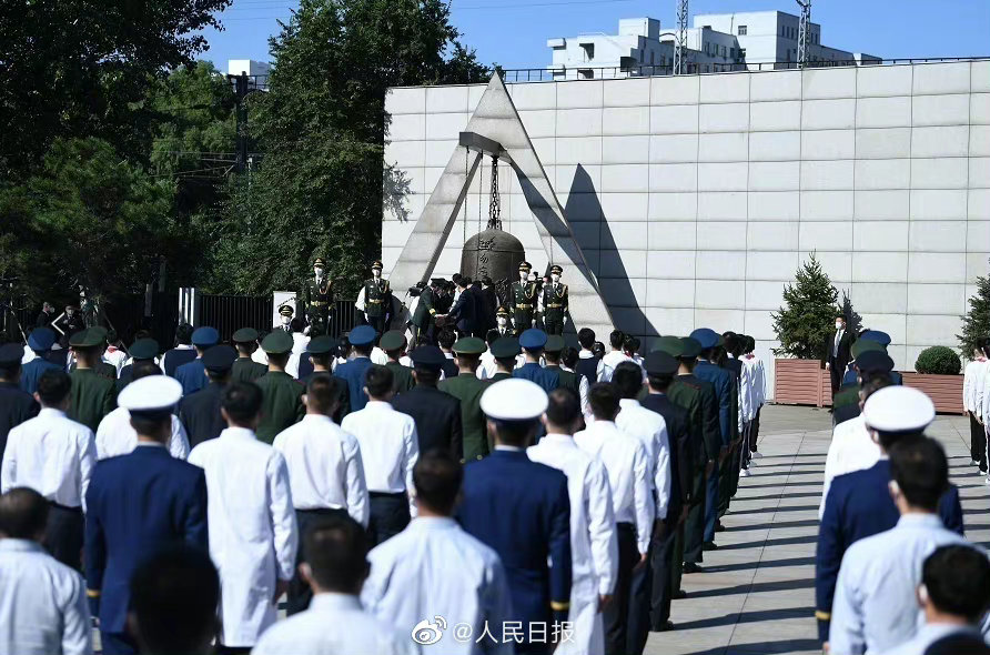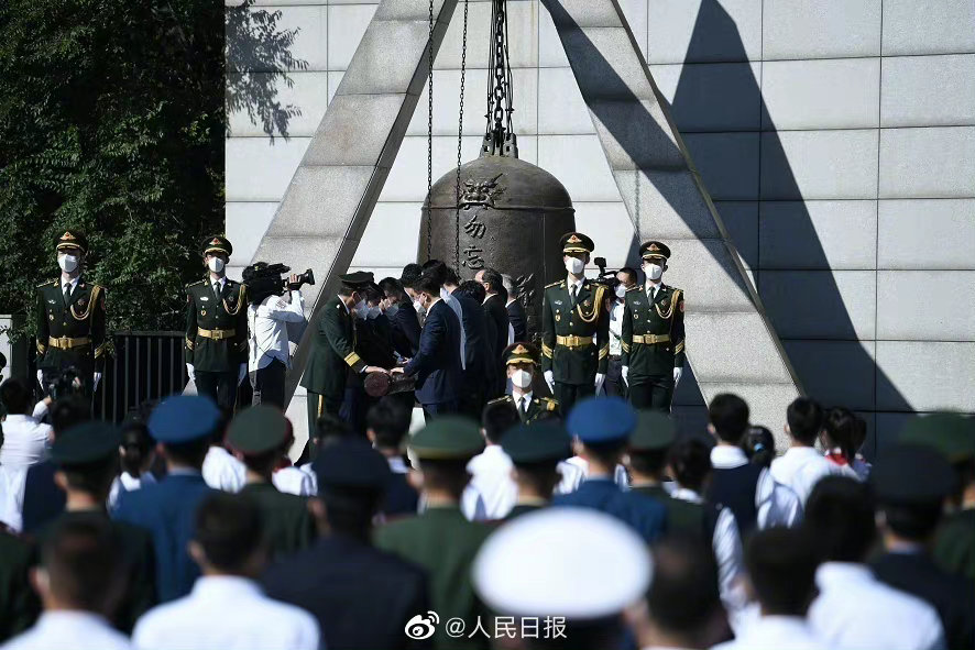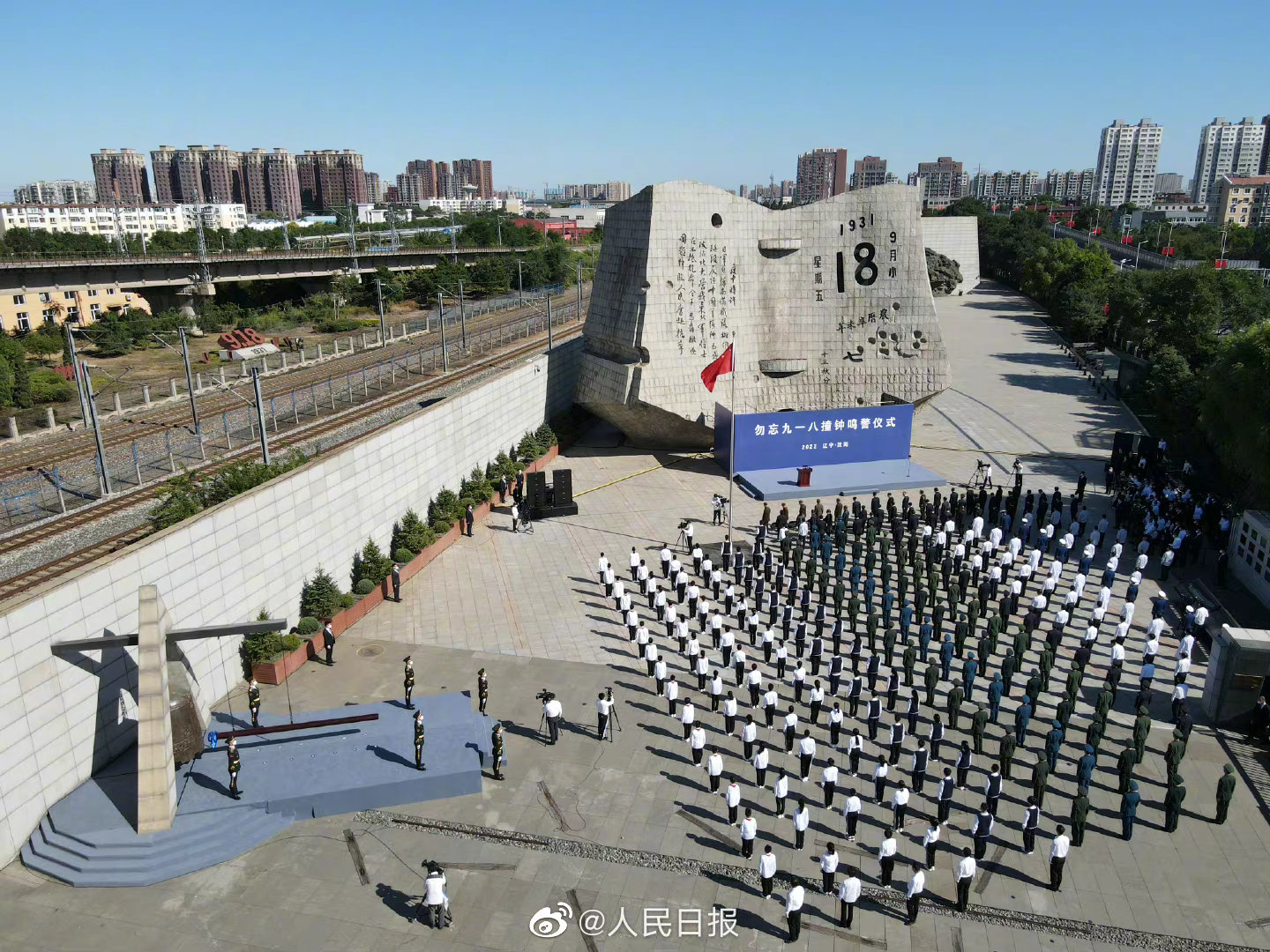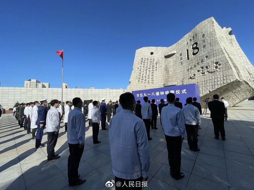 9月18日上午,勿忘九一八撞鐘鳴警儀式在瀋陽“九一八”歷史博物館殘歷碑前廣場舉行。9時18分,參加儀式的各界代表共同撞響“警世鐘”,14響鐘聲迴盪在長空。隨後,瀋陽全城上空拉響防空警報。今日中國再不是1931年的中國,勿忘國恥,警鐘長鳴!