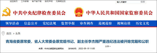 據中央紀委國家監委網站19日消息,日前,經中共中央批准,中央紀委國家監委對青海省委原常委,省人大常委會原黨組書記、副主任李傑翔嚴重違紀違法問題進行了立案審查調查。